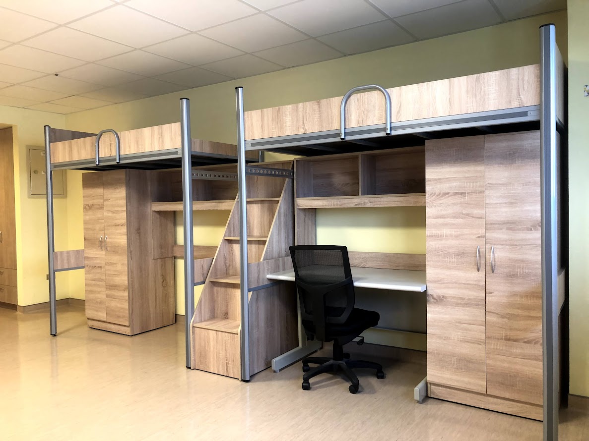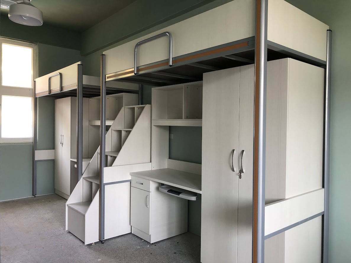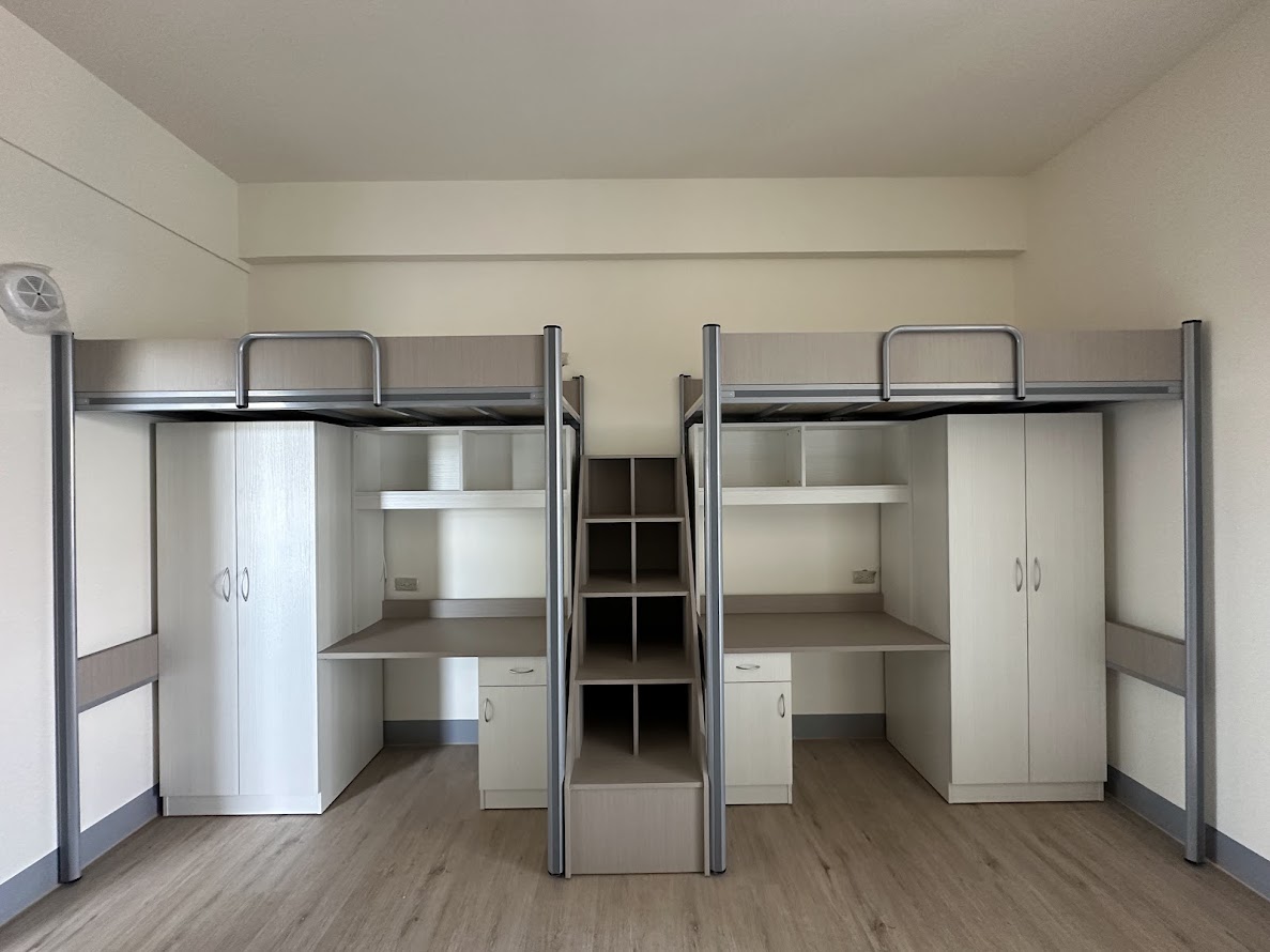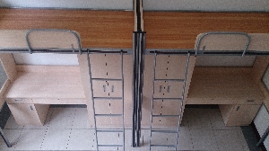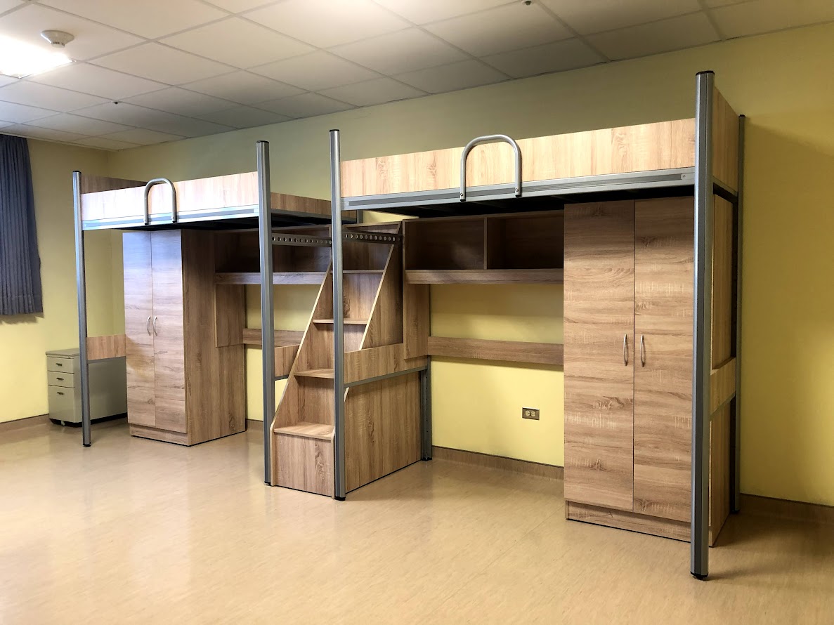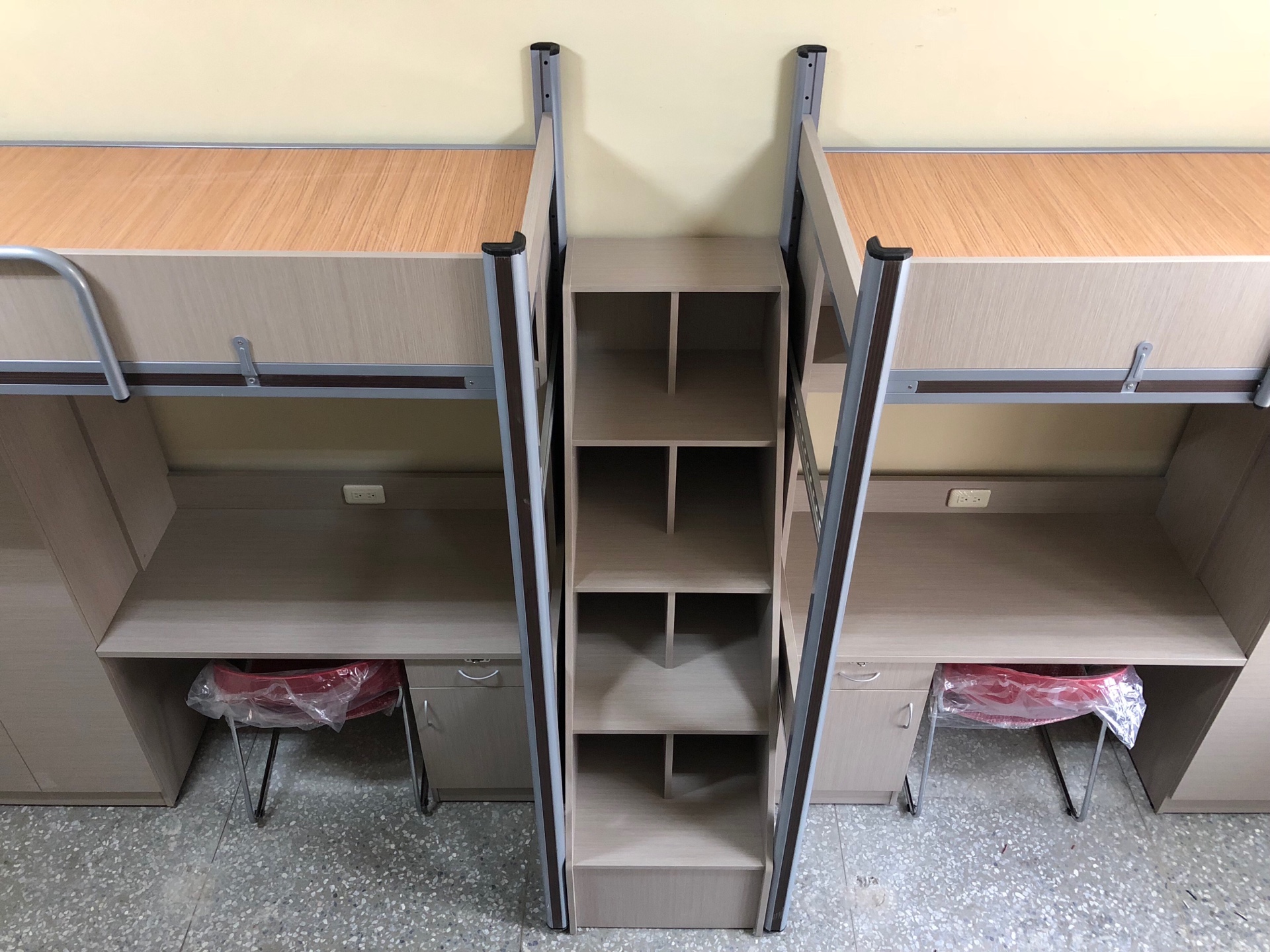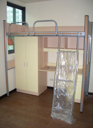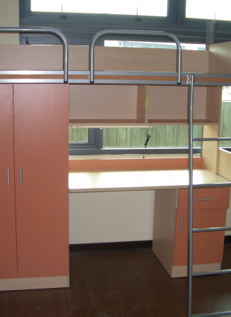 ﹝1﹞床立柱L弧型條高級鋁合金材質,表面粉體塗裝或陽極處理,每75mm沖孔(直徑9 mm) 可依需求床舖作上下調整,外加PVC硬質飾條將沖孔掩飾。