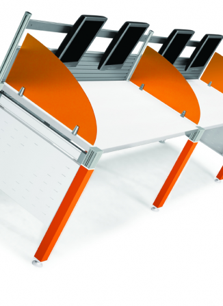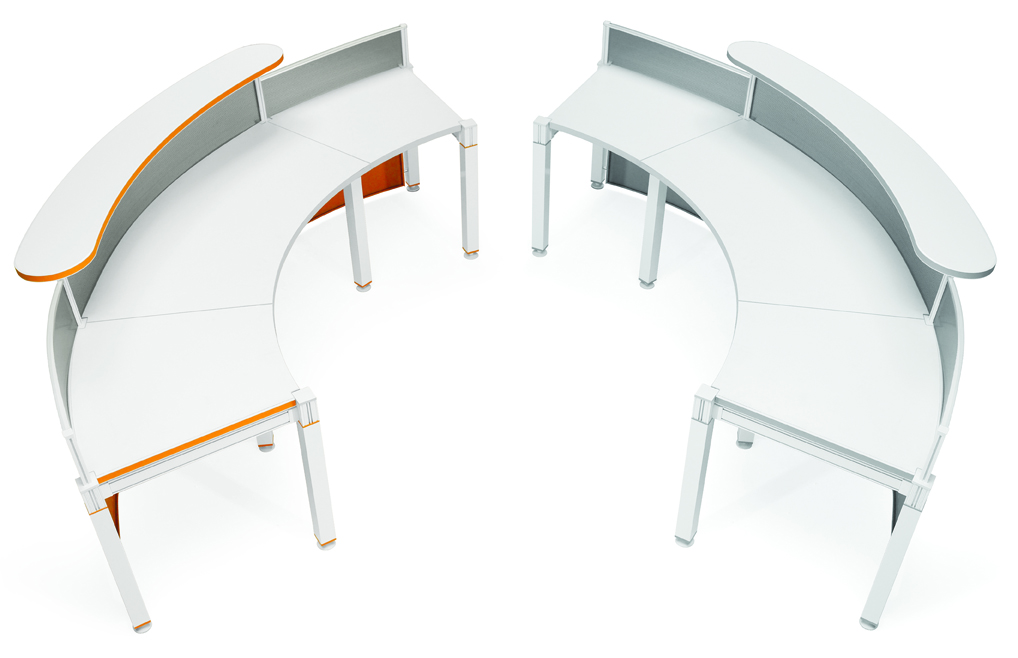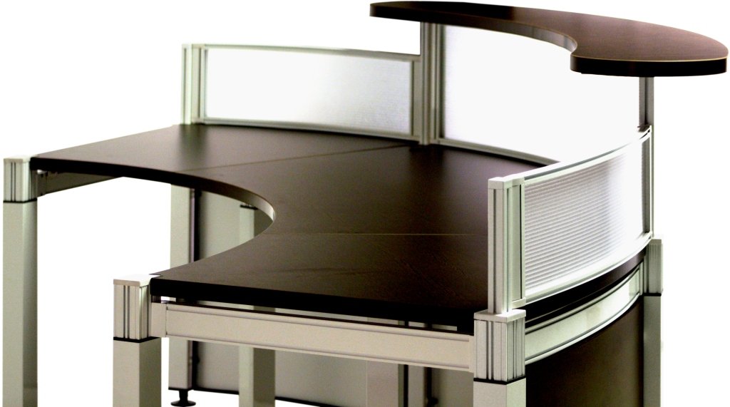 ﹝1﹞桌板採30mm塑合板,面貼美耐板 ﹝2﹞橫樑E管採鋁擠型鋁合金 ﹝3﹞桌屏鋁框,桌腳鋁合金陽極處理 ﹝4﹞檔板凸點烤漆鋼板